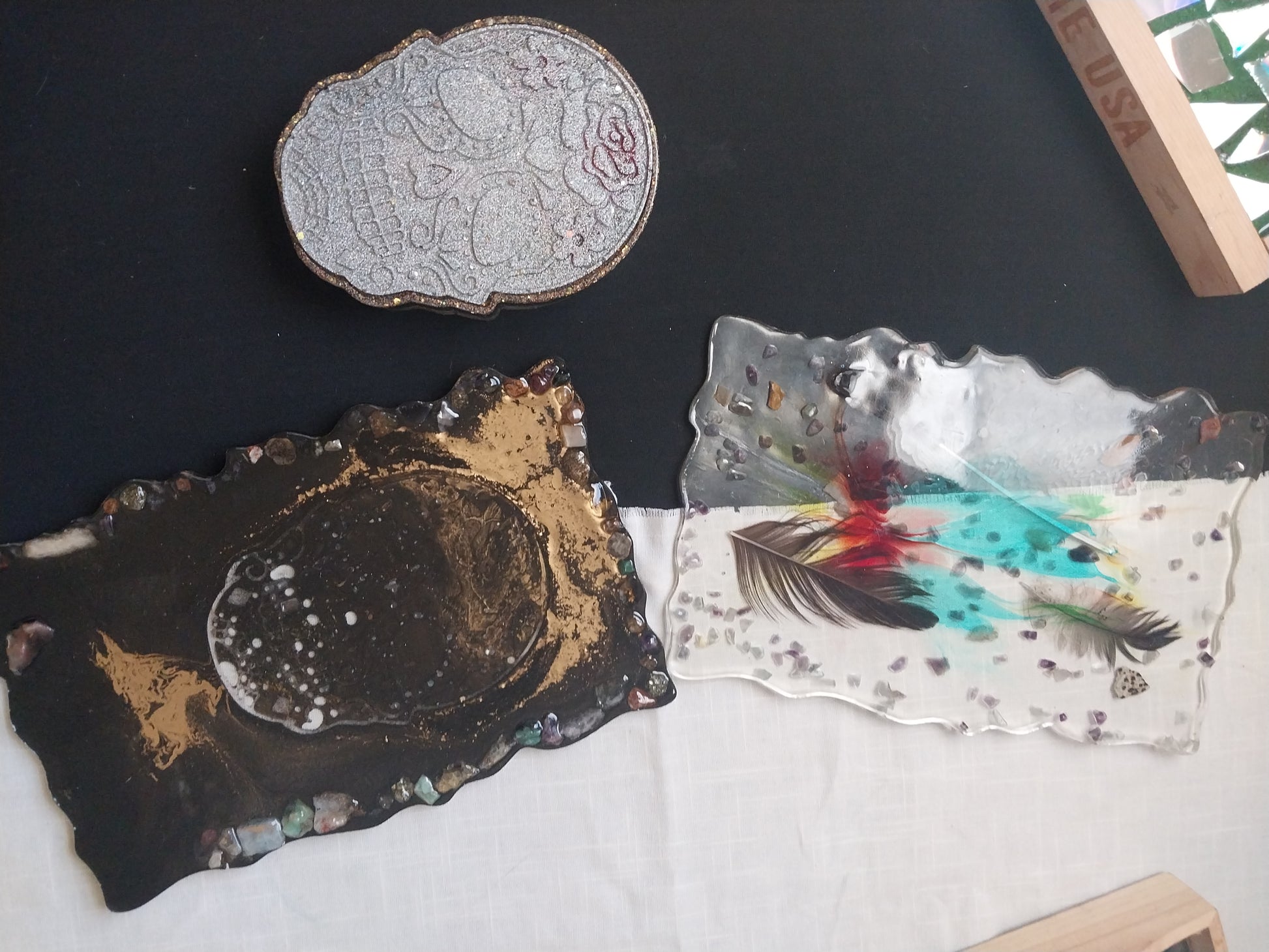 Add a touch of edgy elegance to your home decor with our Black and Gold Skull Tray with Stones. Featuring a sleek black and gold epoxy tray and natural stones, this unique piece is perfect for holding keys, jewelry, or other small items. Quirky and versatile!