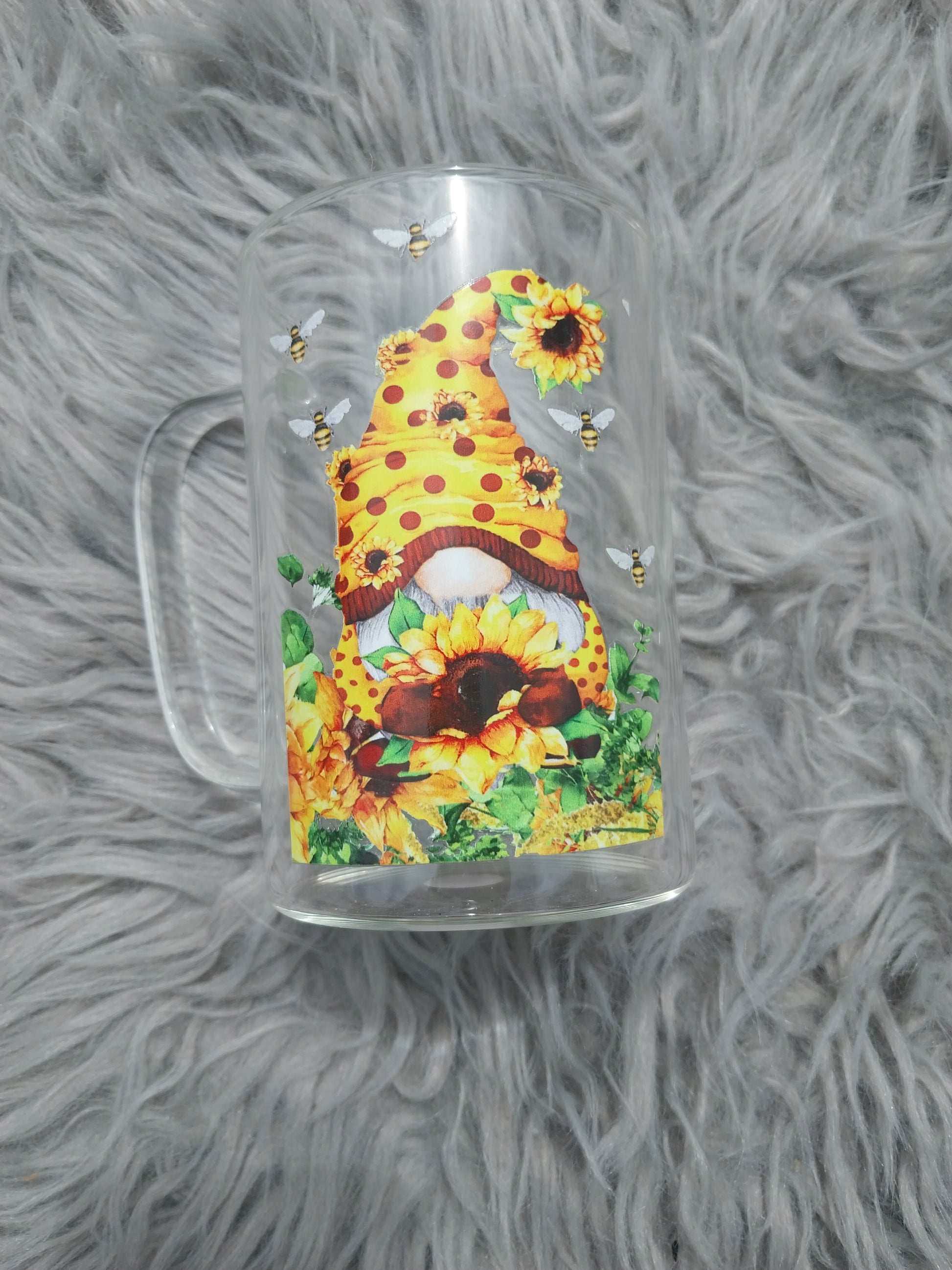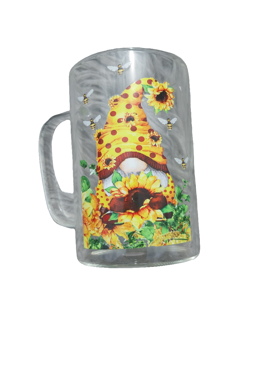 Meet our Gnomes Glass Mug! This quirky mug features a cute sunflower design and is crafted from durable glass with a convenient handle. Sip your favorite beverage in style while adding a touch of whimsy to your day. (Gnome way you won't love it! 😉)