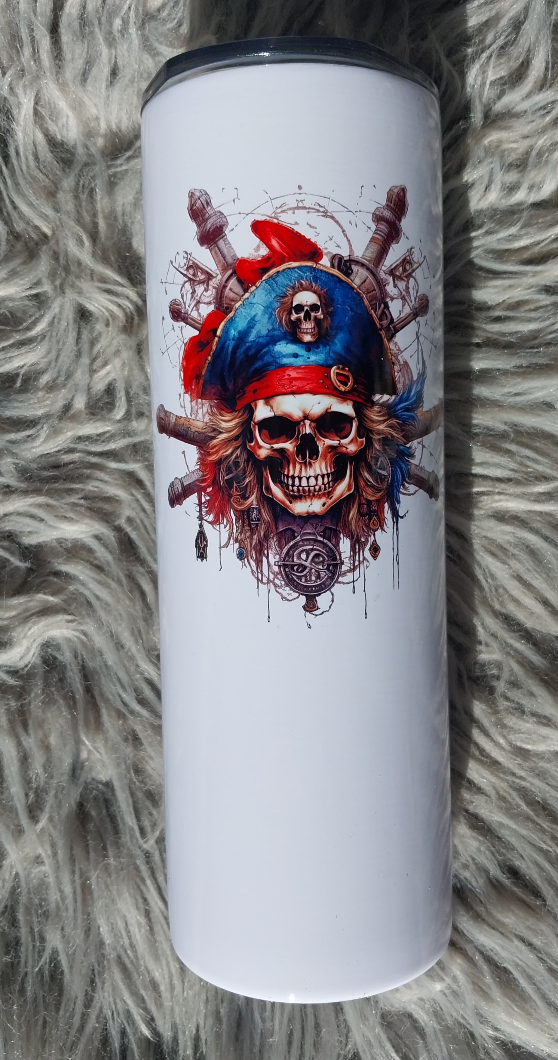"Stay hydrated and show off your pirate pride with the patriotic skull design on this 20 oz tumbler. Perfect for keeping your drinks cold (or hot!), this tumbler adds a touch of quirky fun to every sip. Take it on your next adventure, matey!"